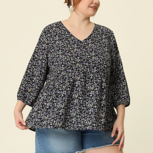 Women's Plus Size Top V Neck Babydoll Flowy 3/4 Lantern Sleeve Floral Blouse