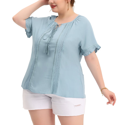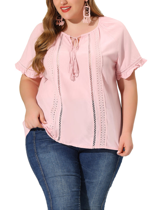 Women Plus Size Blouse Tie Neck Ruffle Short Sleeve Summer Lace Crochet Top
