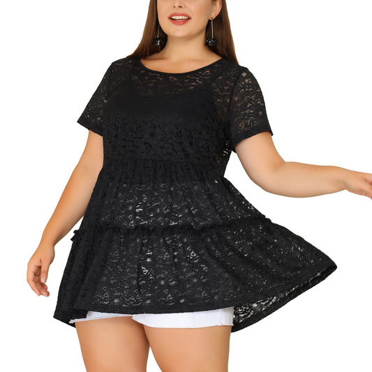 Women Plus Size Babydolls Blouse Lace Allover Short Sleeve Tiered Peplum Top