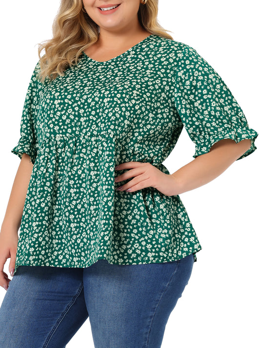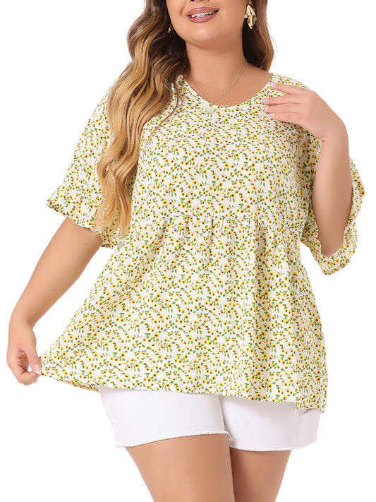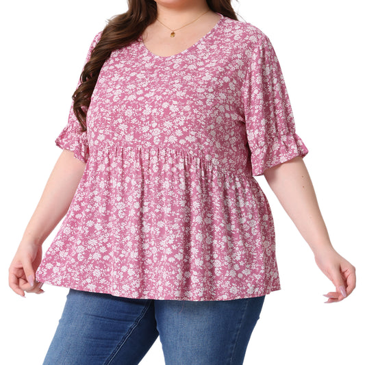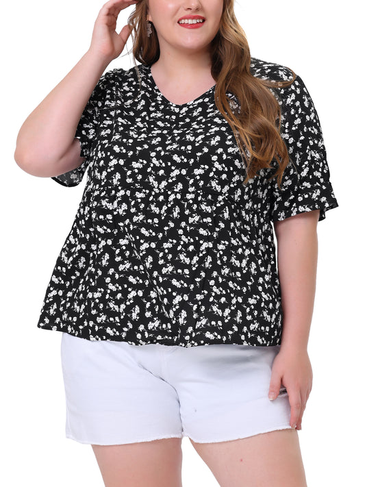 Women's Plus Size Top V Neck Floral Print Ruffle Short Sleeve Tiered Babydoll Blouse