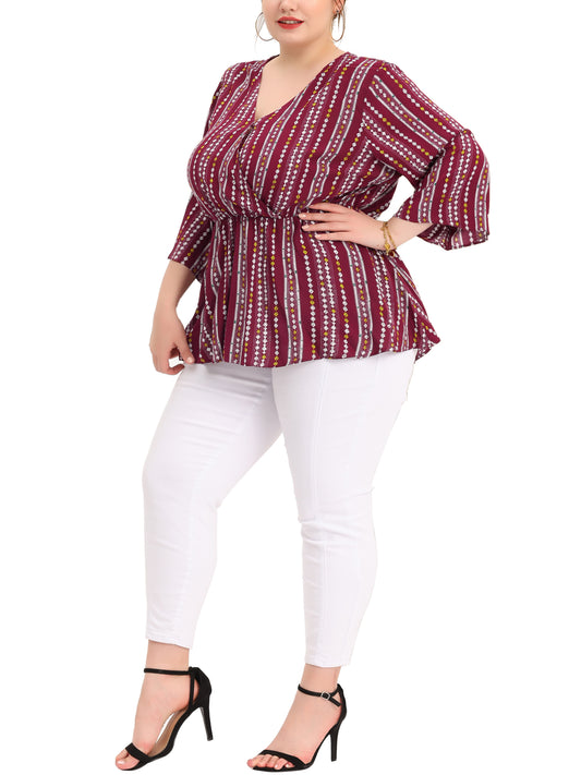 Women Plus Size Top Boho Work V Neck Striped Peplum Blouse