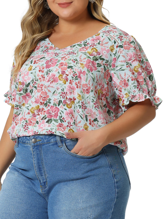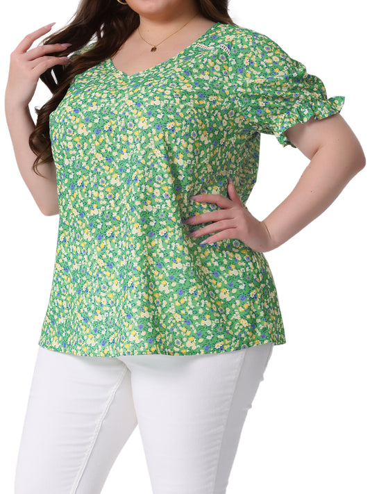Women's Plus Size V Neck Ruffle Short Sleeve Blouses Floral Top