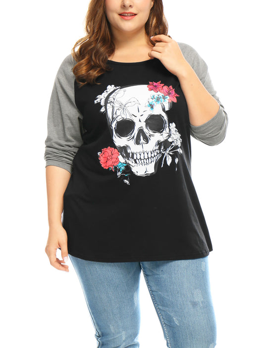 Women's Plus Size Tee T-Shirt Floral Skull Long Sleeve Tops Loose Tunic