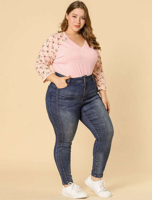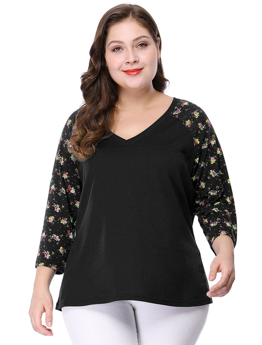 Women's Plus Size Top Casual V Neck 3/4 Sleeve Floral Raglan Top T-Shirt