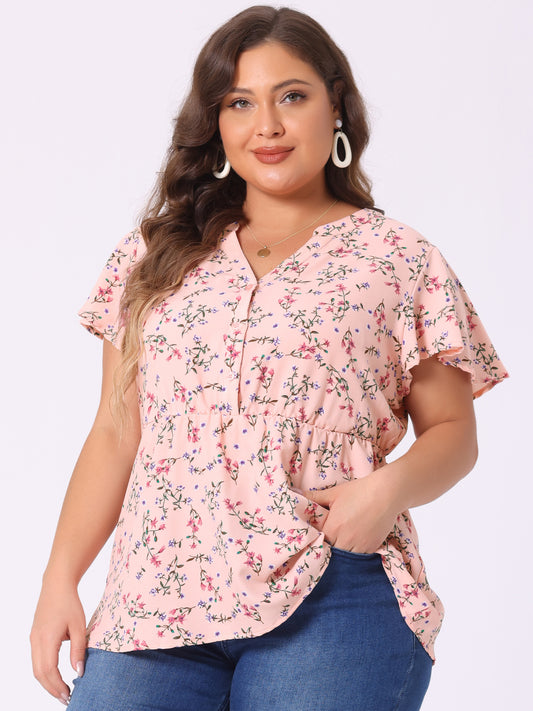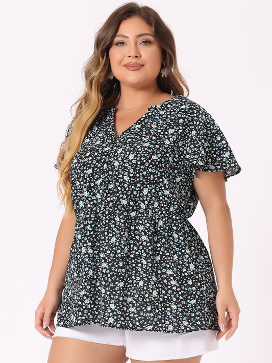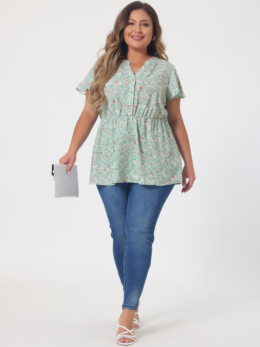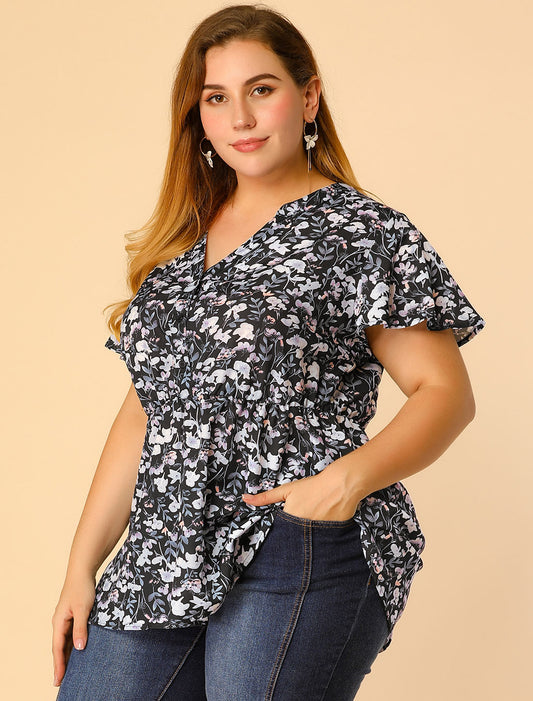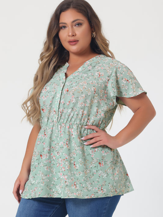 Women's Plus Size Floral Tops Elastic Waist Lightweight Chiffon Blouses Summer Top
