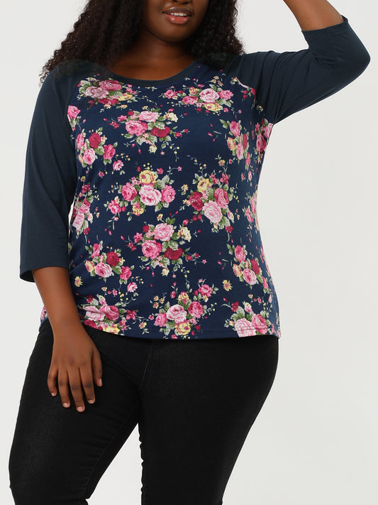 Women's Plus Size Raglan Crewneck 3/4 Sleeve Tunic Tee Shirt Floral Print T-Shirt Casual Top