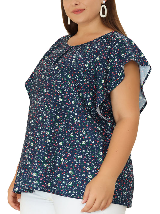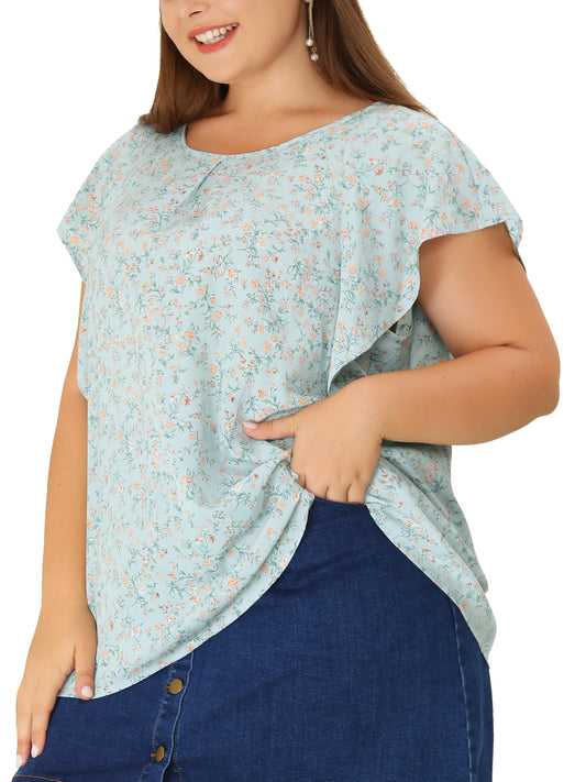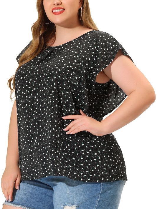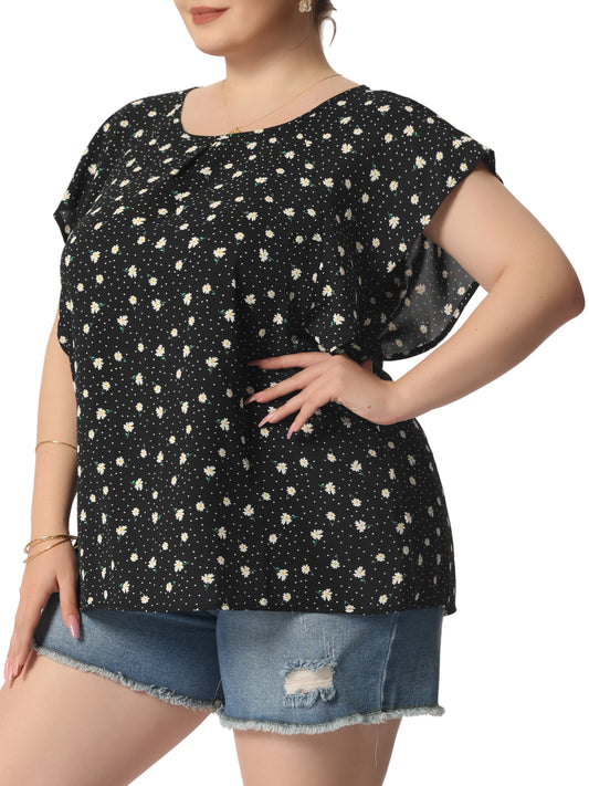 Women Plus Size Top Round Neck Short Sleeve Ruffle Summer Polka Dots Floral Blouse