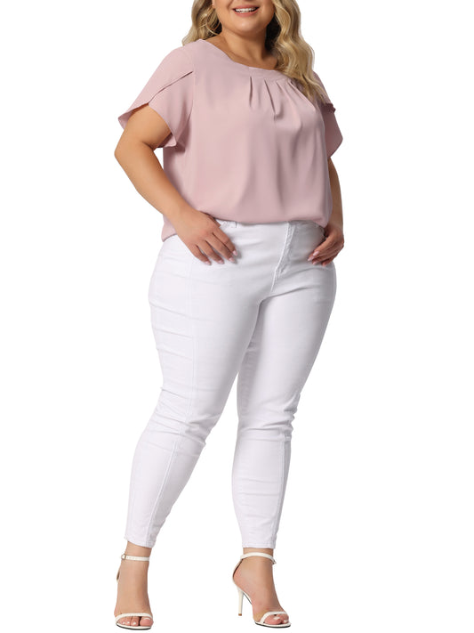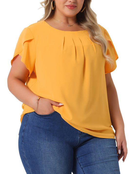 Women Plus Size Work Top Round Neck Pleated Tulip Sleeves Blouse Summer Top