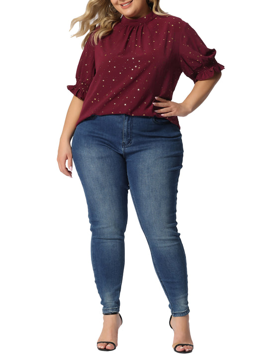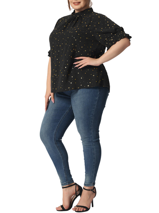 Women Plus Size Blouse Work Office Pleated Mock Neck Star Print Puff Sleeve Top
