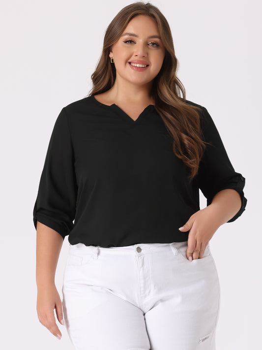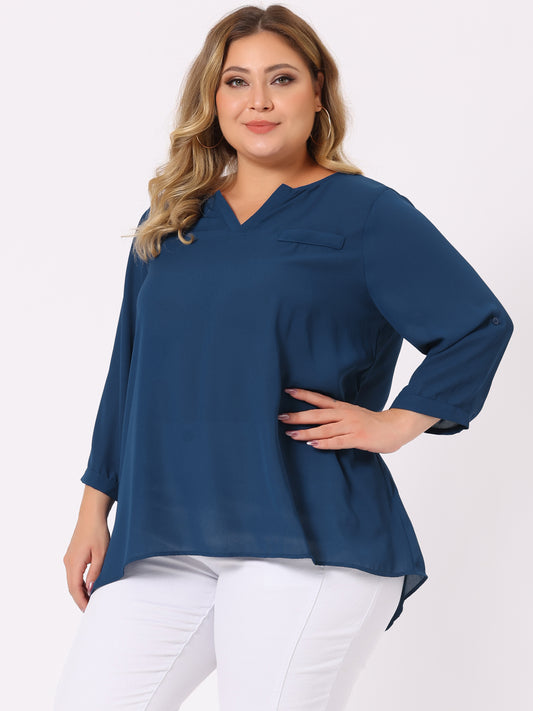 Women Plus Size 3/4 Sleeve Sheer Flowy Summer Split V Neck Blouse