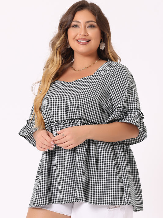 Women Plus Size Gingham Top Sweetheart Plaid Summer Neck Ruffle Sleeve Babydolls Blouse