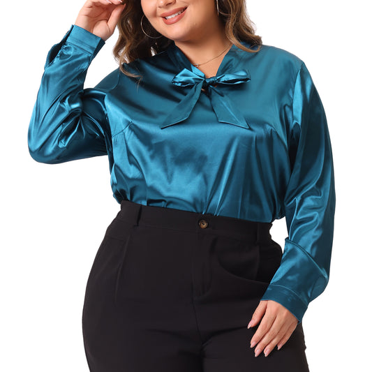 Women Plus Size Blouse Work Office Tie Neck Satin Top Blouse