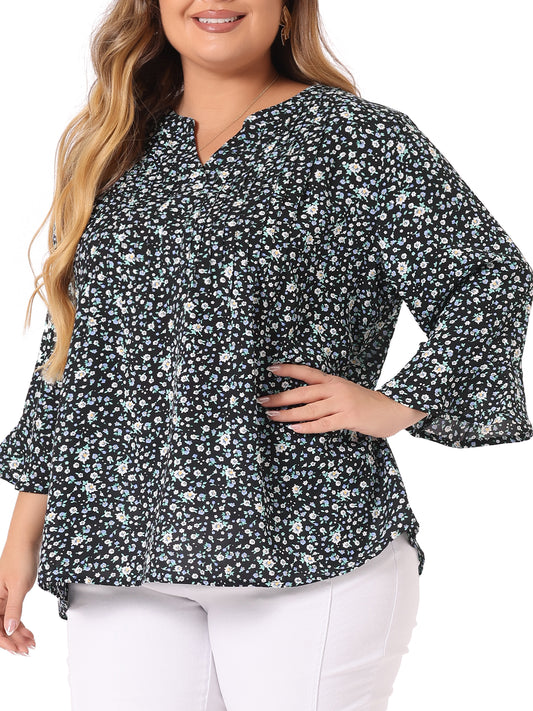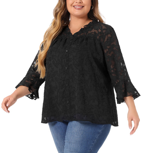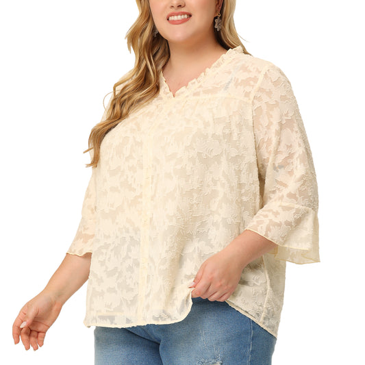 Women Plus Size Top Ruffle V Neck 3/4 Bell Sleeve Semi Sheer Blouse