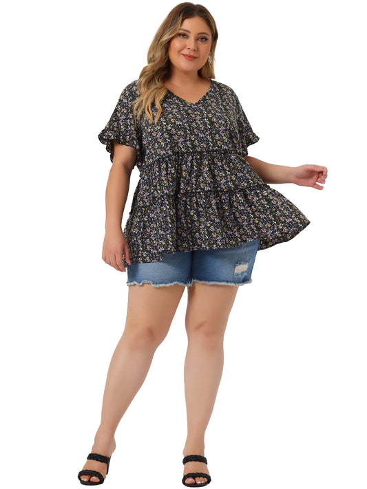 Women Plus Size Tiered Blouse Floral Babydoll Sweetheart Ruffle Short Sleeve Top