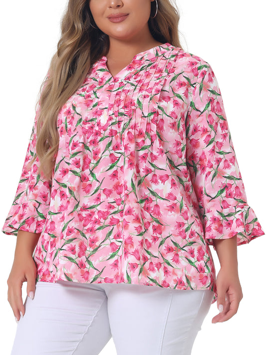 Women Plus Size Top Pleated Long Sleeves V Neck Floral Blouse