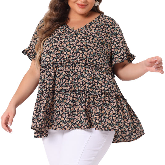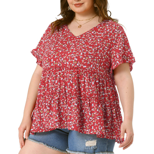 Women's Plus Size Blouse Summer Tops V Neck Short Sleeve Boho Floral Babydolls Blouse