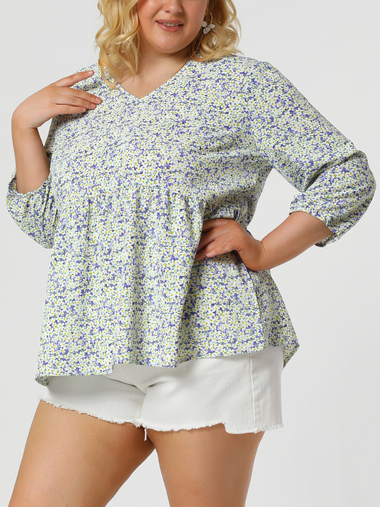 Women's Plus Size Top V Neck Babydoll Flowy 3/4 Lantern Sleeve Floral Blouse