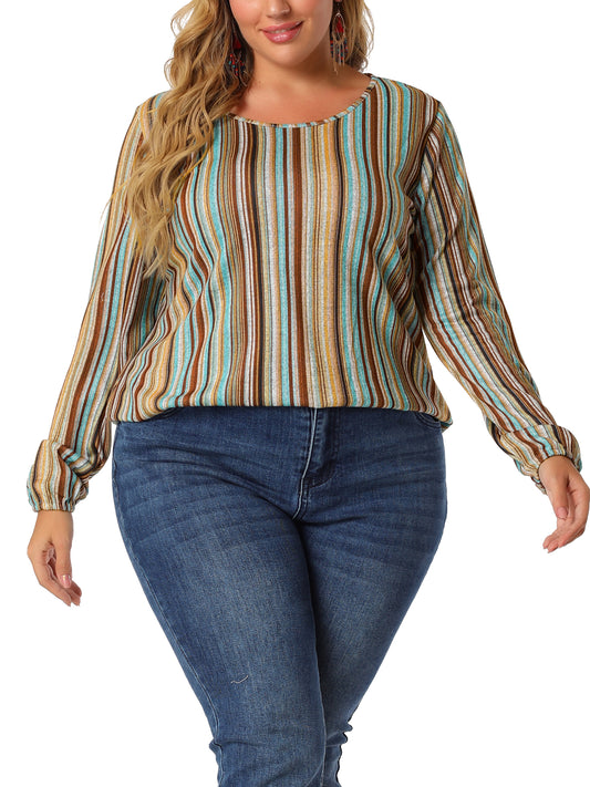 Women Plus Size Boho Color Block Elastic Cuff Long Sleeve Striped Top