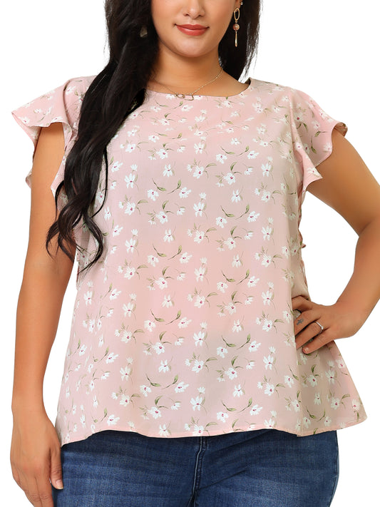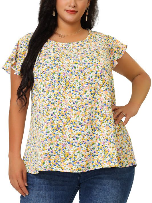 Women's Plus Size Summer Top Floral Round Neck Short Sleeves Ruffle Casual Blouse