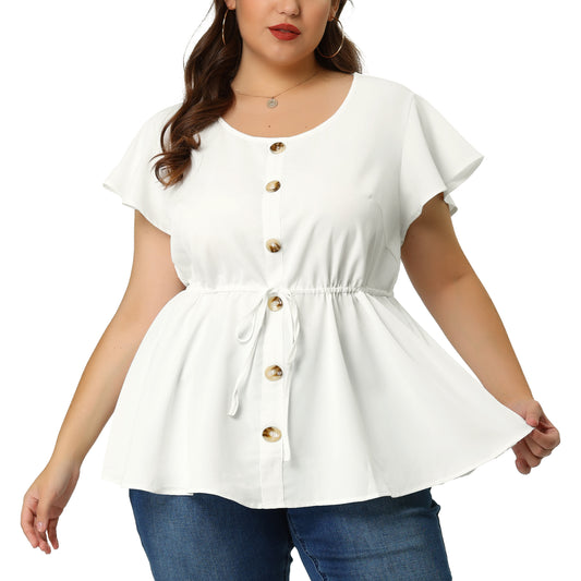 Women Button Decor Drawstring Waist Flare Sleeve Plus Size Peplum Blouse