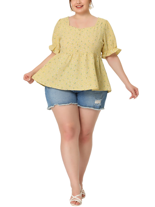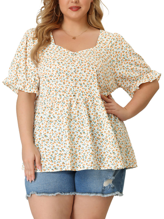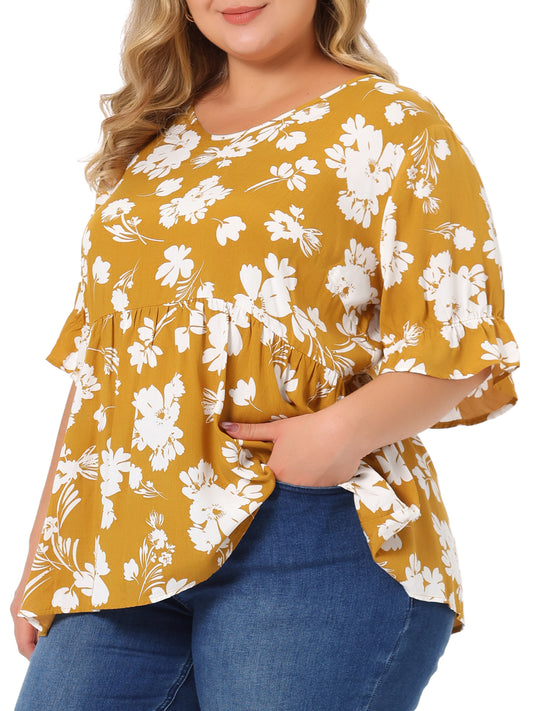 Women's Plus Size Top V Neck Floral Print Ruffle Short Sleeve Tiered Babydoll Blouse