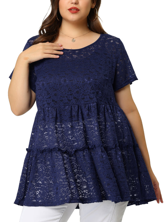 Women Plus Size Babydolls Blouse Lace Allover Short Sleeve Tiered Peplum Top
