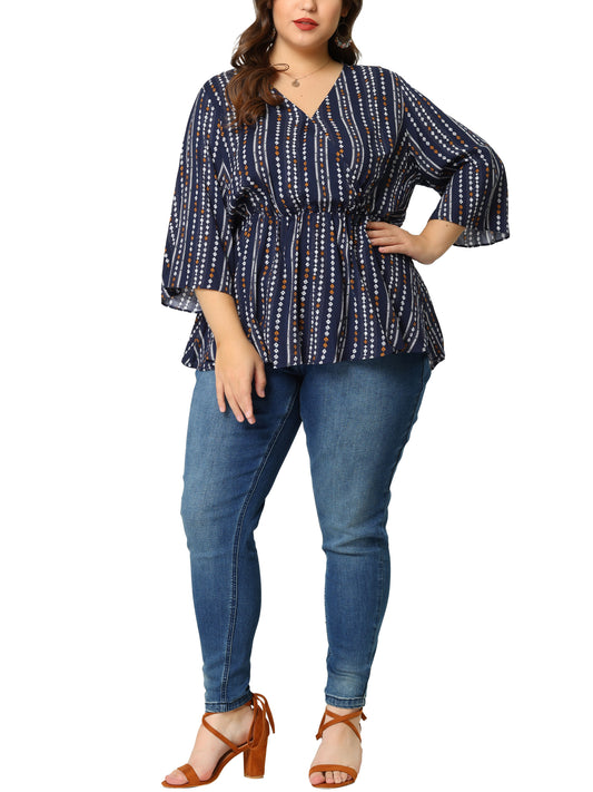 Women Plus Size Top Boho Work V Neck Striped Peplum Blouse