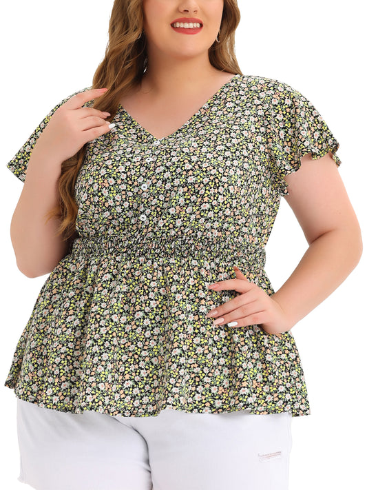 Women Plus Size Blouses Button V Neck Smocked Waist Flare Short Sleeve Peplum Floral Top