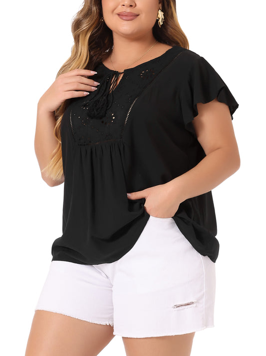 Women Plus Size Blouse Tie Neck Ruffle Short Sleeve Summer Lace Crochet Top