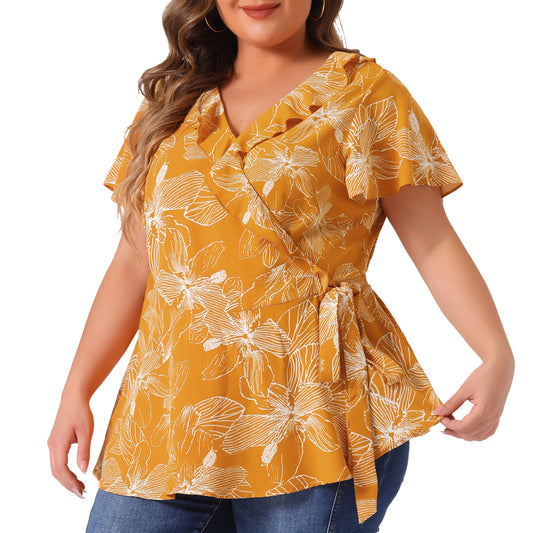 Women Plus Size Wrap V Neck Tie Waist Ruffle Sleeve Blouse Summer Floral Top