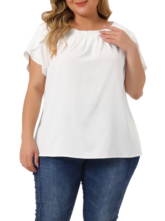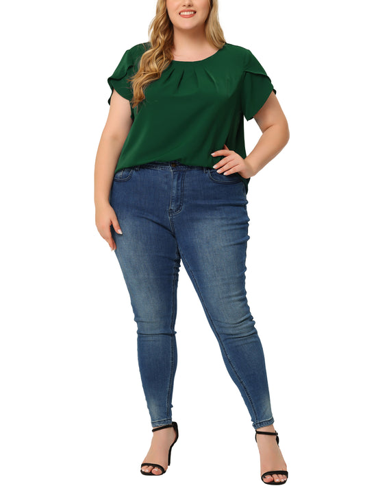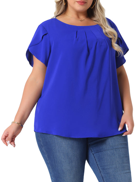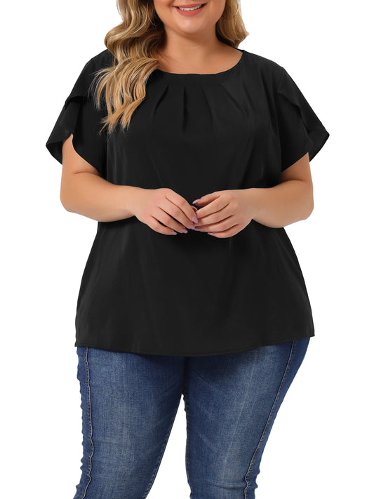 Women Plus Size Work Top Round Neck Pleated Tulip Sleeves Blouse Summer Top
