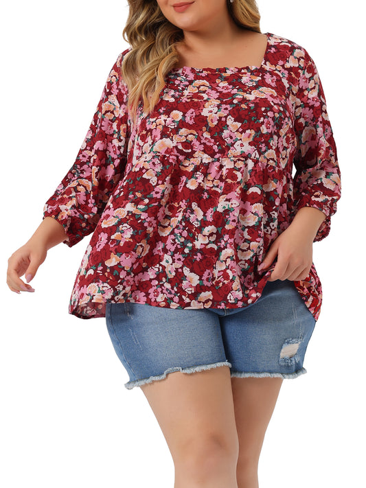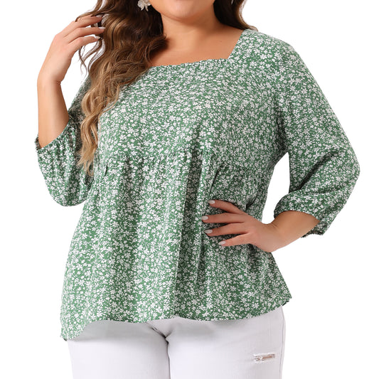 Women Plus Size Blouse 3/4 Sleeve Floral Peplum Babydoll Top