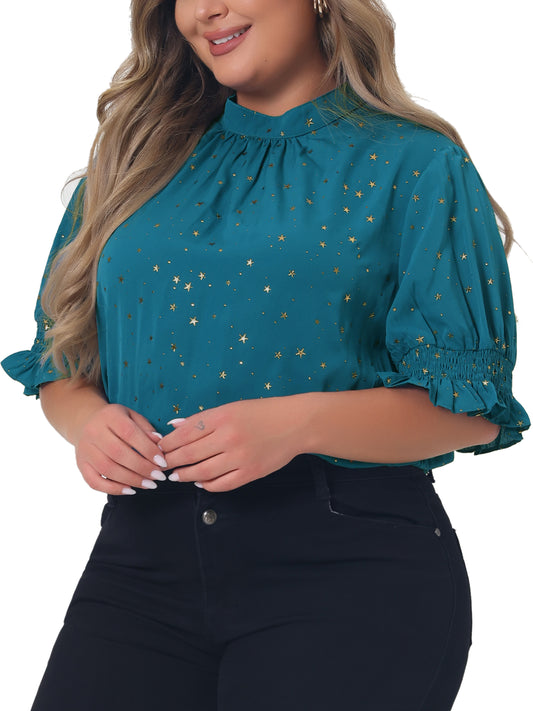 Women Plus Size Blouse Work Office Pleated Mock Neck Star Print Puff Sleeve Top