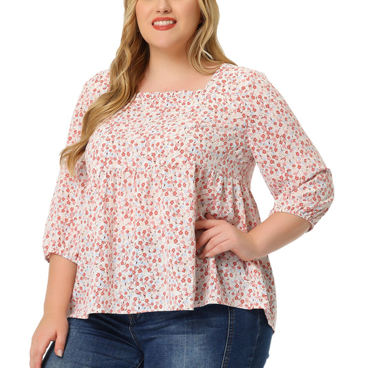 Women Plus Size Blouse 3/4 Sleeve Floral Peplum Babydoll Top