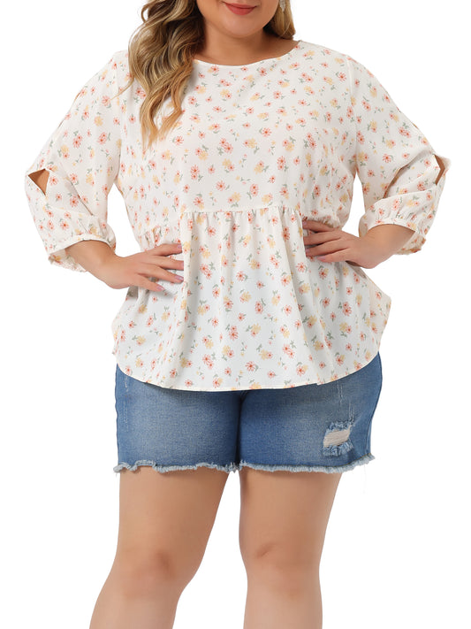 Women Plus Size Floral Blouse Cut Out 3/4 Sleeve Babydoll Peplum Top