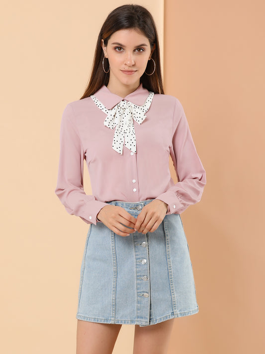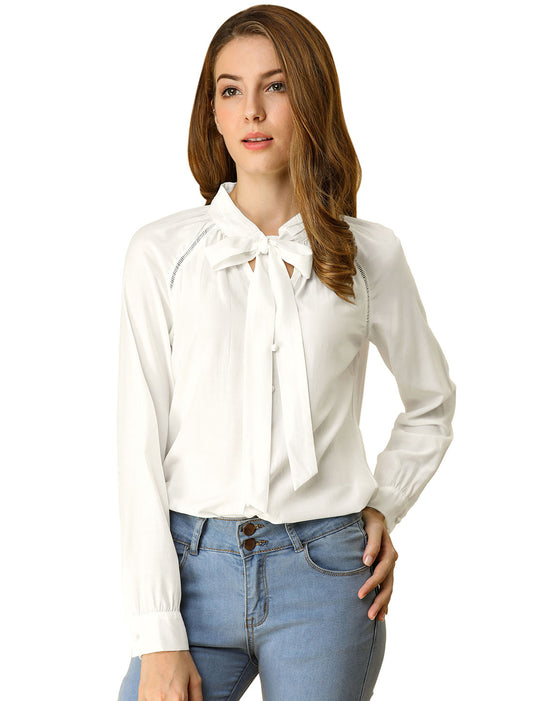 Women's Work Office Tops Bow Tie Neck Button Decor Long Sleeve Shirt Blouse