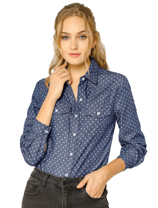 Women's Long Sleeve Point Collar Chambray Poplin Button Down Denim Shirt