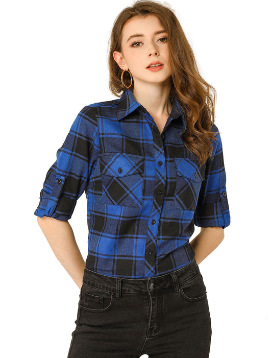 Women's Button Down Turnover Collar Chest Pockets Plaid Shirt