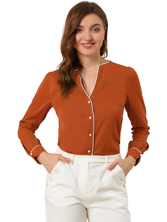 Women's V Neck Long Sleeve Business Casual Contrast Color Piped Button Up Chiffon Blouse Shirt