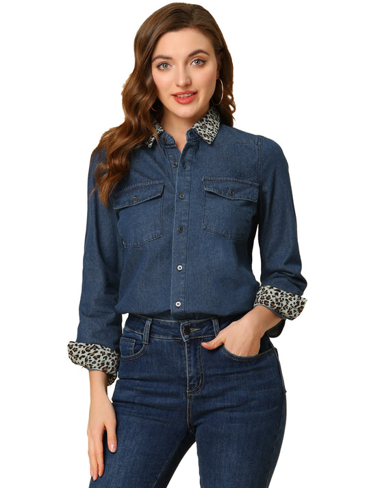 Women's Button Up Jean Shirt Long Sleeve Leopard Denim Shacket