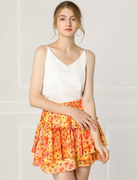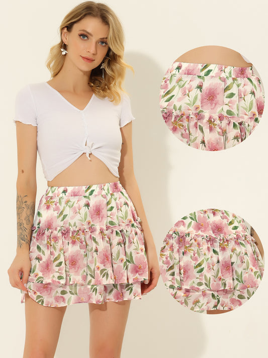 Women's Floral Print Skirt Elastic High Waist Layer Ruffle A-Line Mini Short Skirt