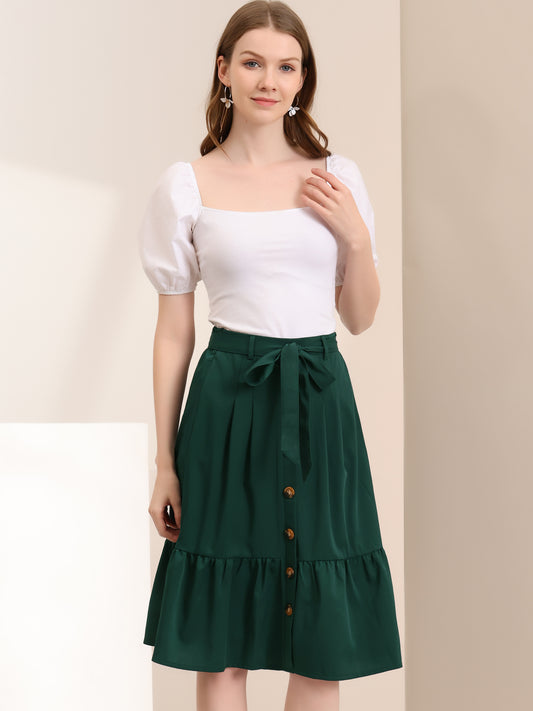 Women's Retro Button Front Tie Waist Flowy A-Line Chiffon Ruffle Midi Skirt