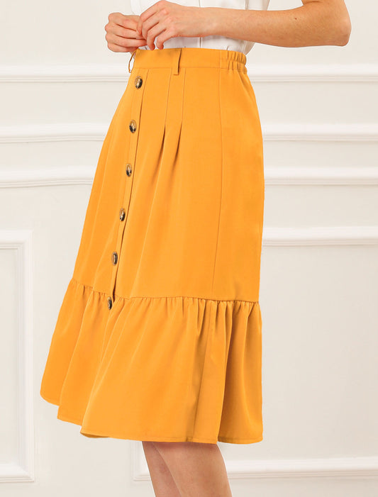 Women's Retro Button Front Tie Waist Flowy A-Line Chiffon Ruffle Midi Skirt