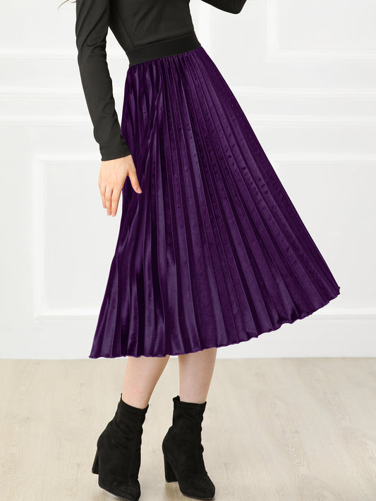 Women's Fall Winter Elastic High Waist Flowy Swing Holiday Velvet Pleated Midi Skirt