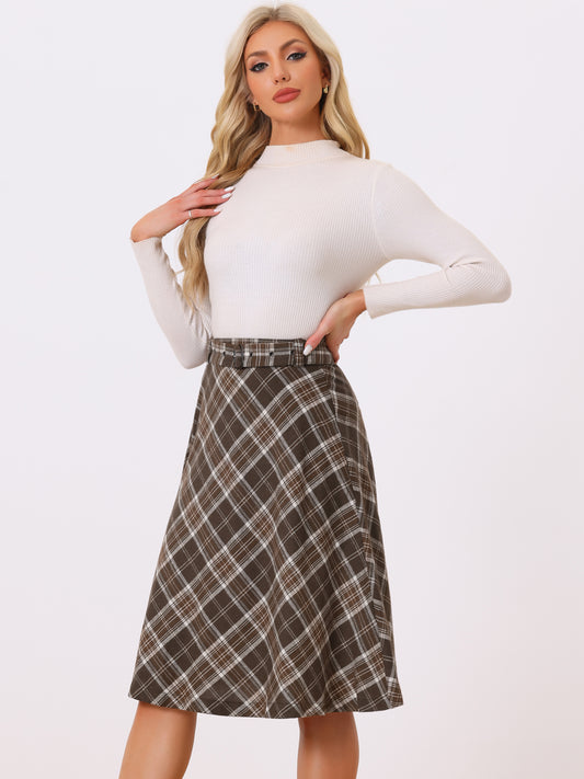 Women's Tartan Plaid High Waist Belted Vintage A-Line Midi Skirt