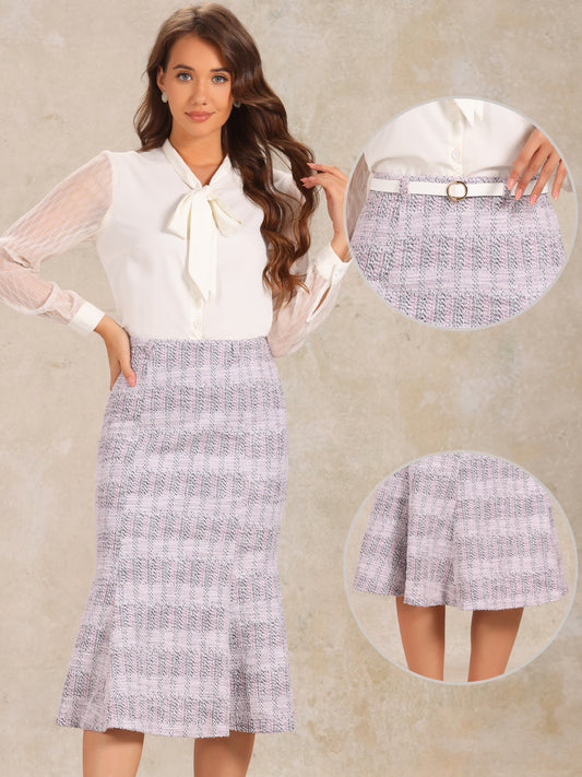 Women's Tweed Midi Skirt Plaid Belted Fishtail Bodycon Skirt