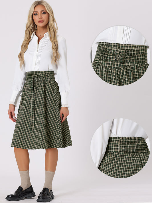Women's Vintage Plaid Belted A-Line Midi Skirt
