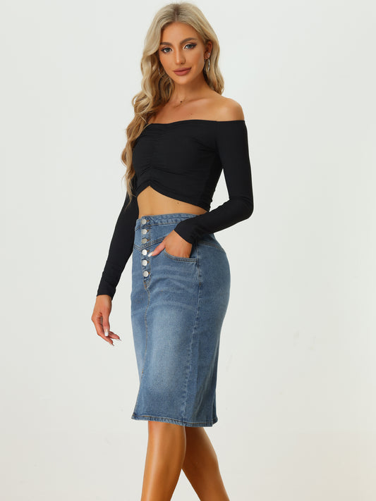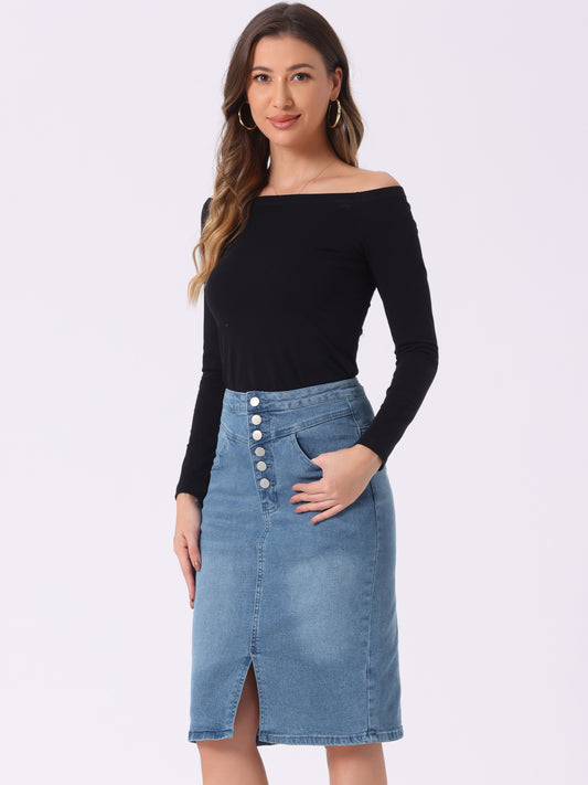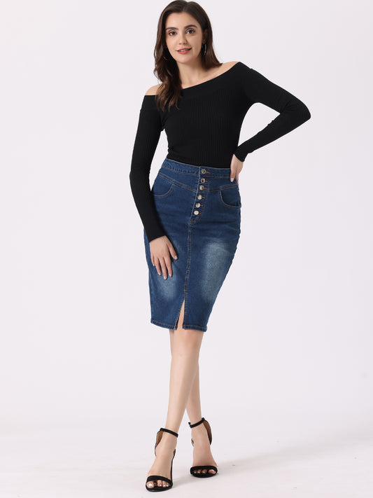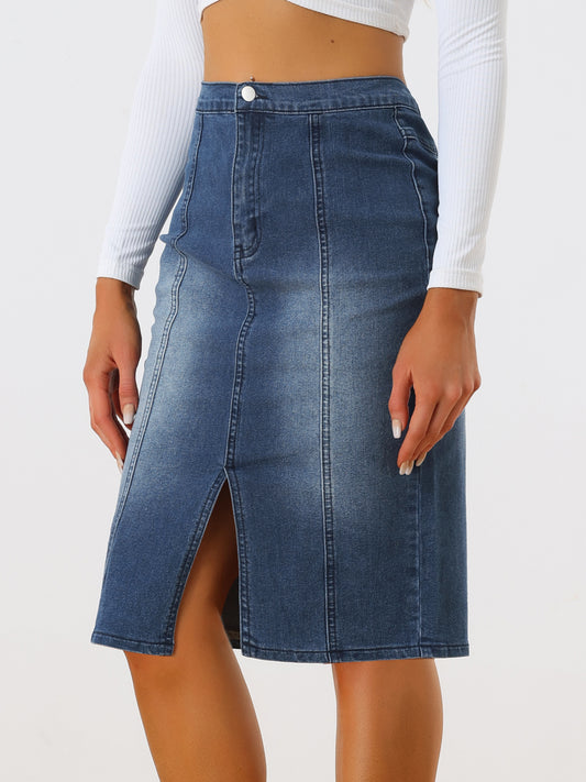 Women's Denim Skirt High Waist Slit Hem Stretch Bodycon Pencil Skirt Knee Length Jean Skirts