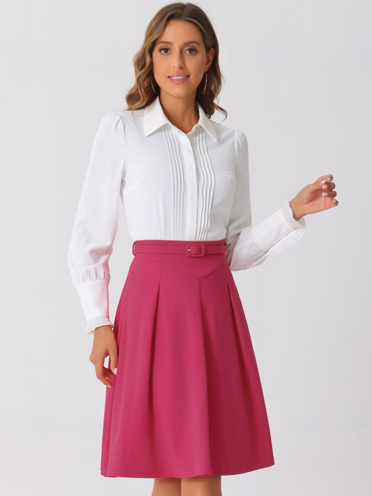 Women's Office Work Skirts Belted Waist Midi A-Line Pleated Skirt