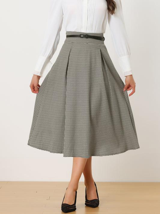 Women's Winter Fall Homecoming Vintage A-Line Elastic High Waist Swing Plaid Midi Skirt with Belt